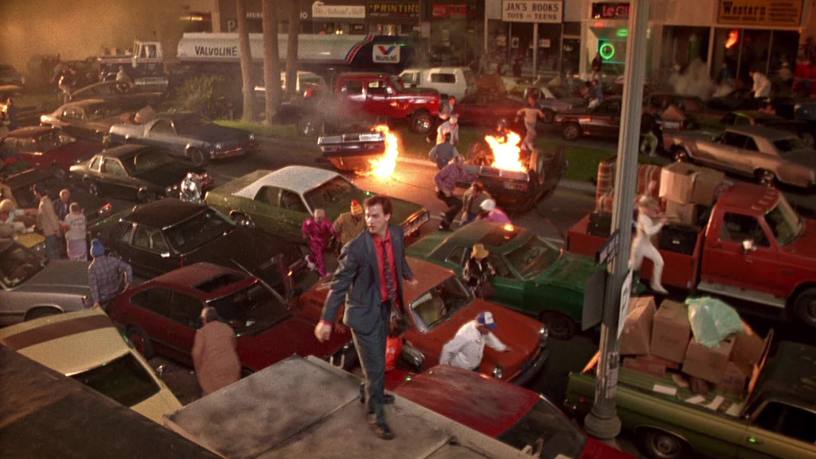 Miracle Mile is a fantastic thriller that deals with the absolute terror instilled in ordinary people by the impending threat of nuclear war. After Harry receives the original phone call, the film’s action plays out in real time, following Harry and Julie as they try to survive amidst the panic and chaos filling the streets of Los Angeles. Civilians shoot other civilians, police cars are stolen and crashed into shops, police officers not curbing the ramping violence. People losing their minds over such an earth-shaking event.